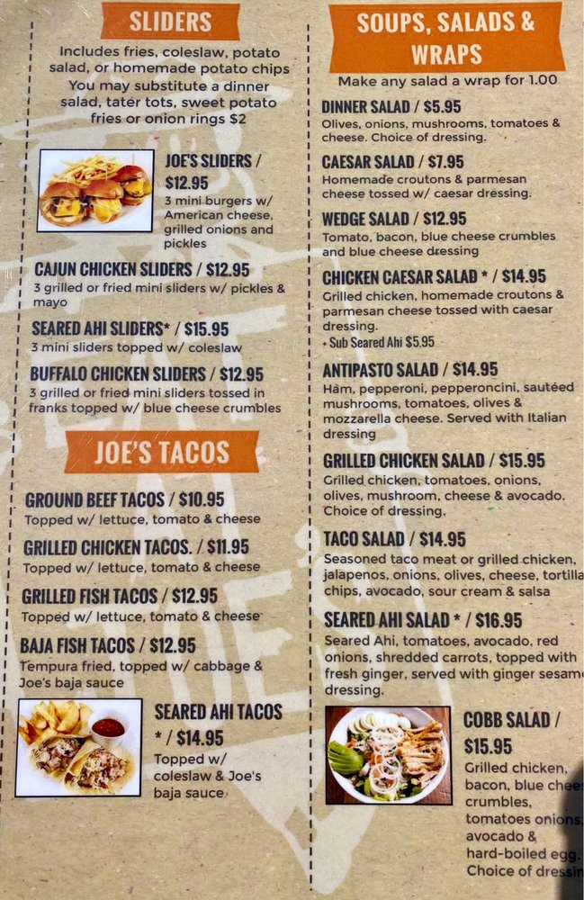 “ I love Joe's! Everyone that works here is friendly and kind. The menu is diverse. They have daily specials and rotating taco Tuesday offerings. Their sloppy Joe is delicious. Get the naked wings, Diego style. Homemade chili here is perfect, especially with their taco salad. Monday they have buy one get one half off their grandma style burgers. Come to watch a game, they will have the sound on. With almost 30 TVs you will have plenty to watch. ”
